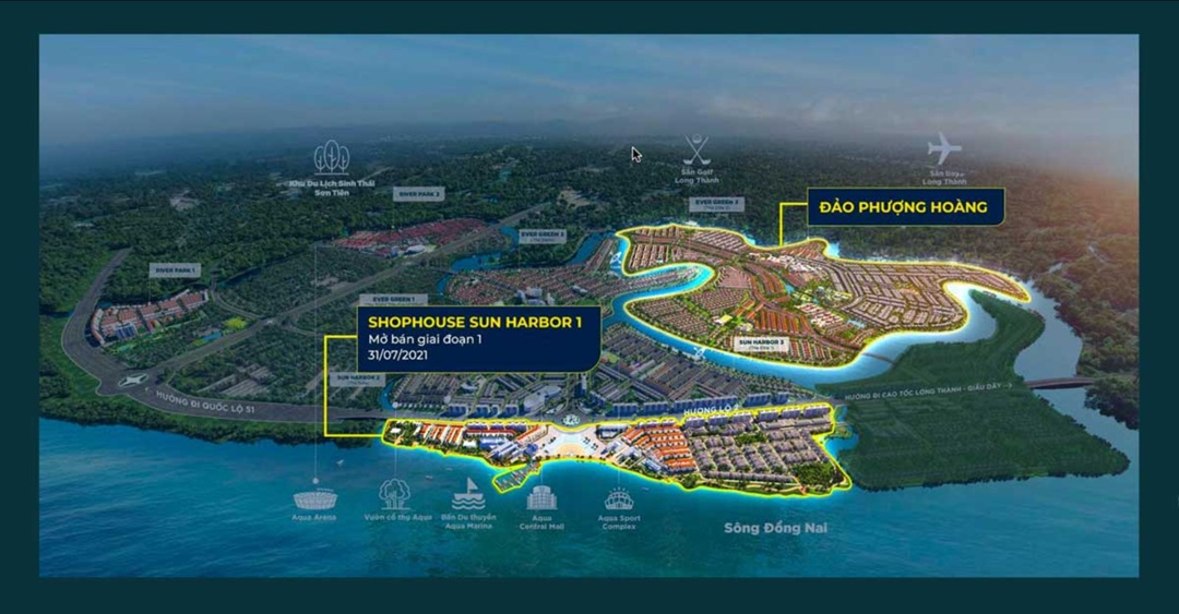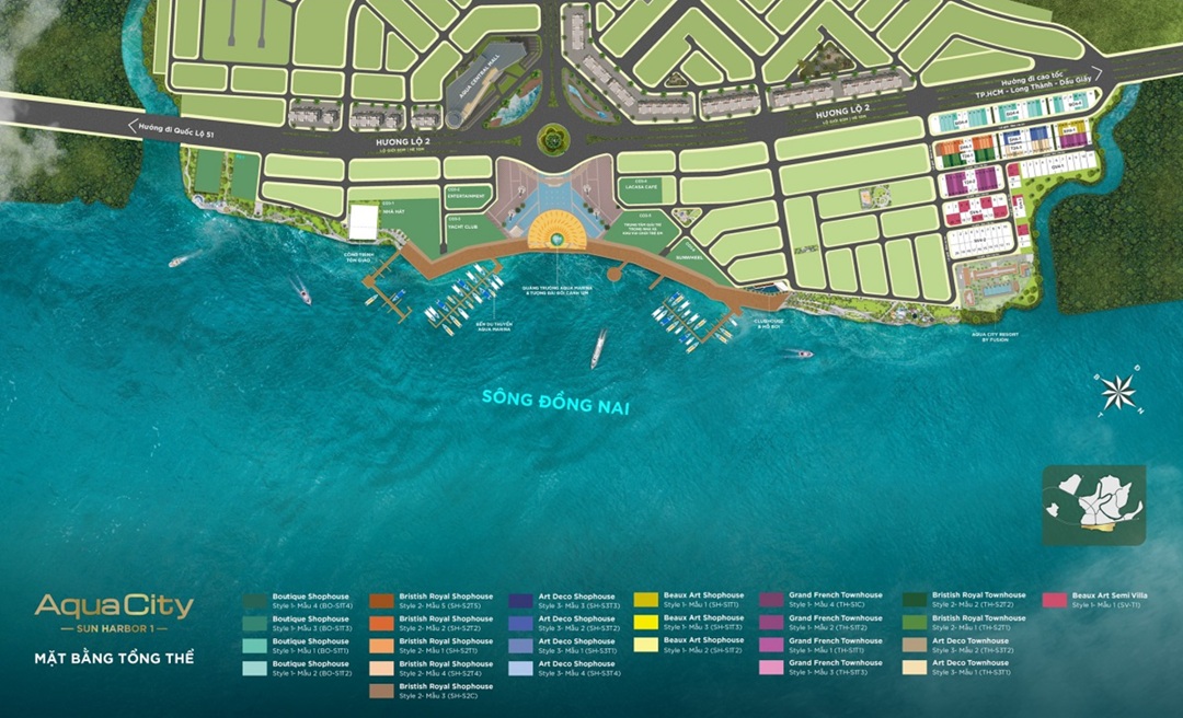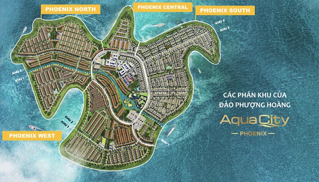 - Aqua City có tám khu chính: Đảo Phượng Hoàng, Đảo Sun Harbor, River Park 1, Grand Villas, Valencia, Stella, Elite, Suite