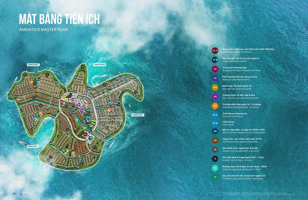 - Tiện ích bao gồm 385 ha diện tích mặt nước, 25 ha công trình giáo dục các cấp, 3 ha công trình y tế, 32 km đường sông, 20 công viên chủ đề, 70% diện tích mảng xanh và tiện ích chung.