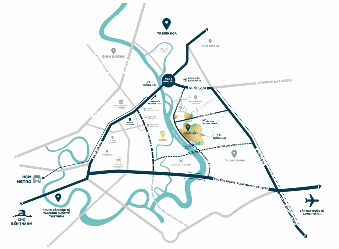 Khu đô thị Aqua City Biên Hòa nằm ngay trên trục đường lớn Hương Lộ 2, sát quốc lộ 51 và cao tốc TPHCM Long Thành Dầu Dây và chỉ cách Quận 9 qua sông Đồng Nai.