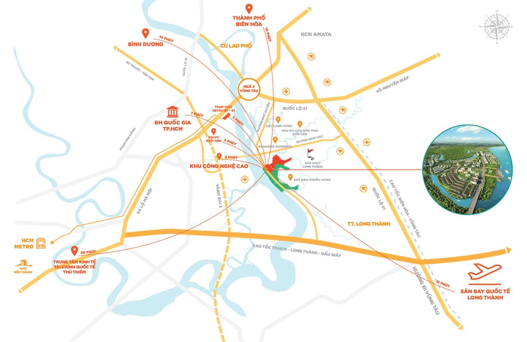 Trung tâm kết nối của vùng: Khu đô thị Aqua City tọa lạc ngay xã Long Hưng, TP Biên Hòa đây là trung tâm kết nối giao thông của các tỉnh Đông Nam Bộ và Tây Nguyên, hơn nữa đây là cửa ngõ giao thông phía đông của TP HCM – Nơi trực tiếp kết nối tới các tỉnh miền Trung và miền Bắc.