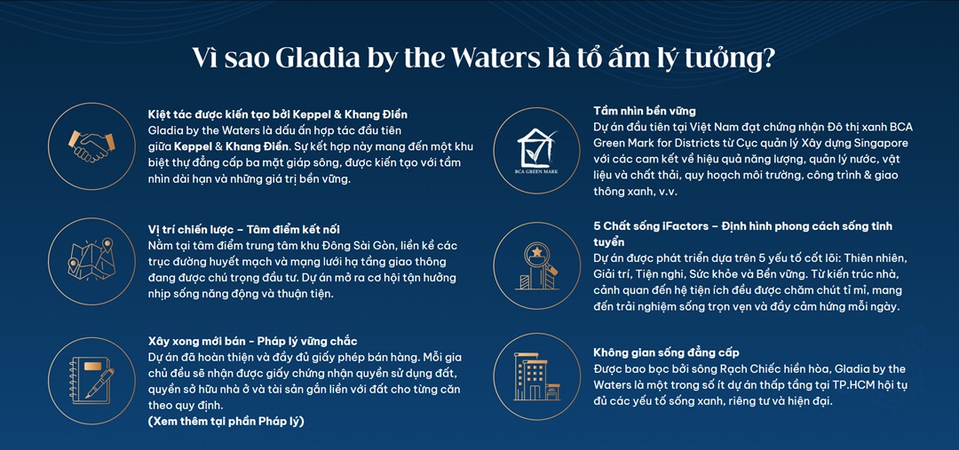 Gladia Heights là một phần của đại đô thị Gladia by The Waters, được thiết kế theo phong cách “chuẩn sống Singapore—đô thị sinh thái ven sông” và cân bằng giữa cuộc sống năng động và không gian thư giãn riêng tư. Tập đoàn Khang Điền và Tập đoàn Keppel Land đã xây dựng tiện ích Gladia Heights như một bản giao hưởng hoàn hảo của cuộc sống hiện đại. Mỗi tiện ích trong số đó có một mục tiêu riêng biệt nhằm cải thiện trải nghiệm sống của cư dân. Dự án này đã định nghĩa lại khái niệm về một khu đô thị sinh thái cao cấp tại Việt Nam, với tổng diện tích lên đến 1.25 hecta dành riêng cho năm công viên chủ đề và hơn mười tiện ích đẳng cấp.