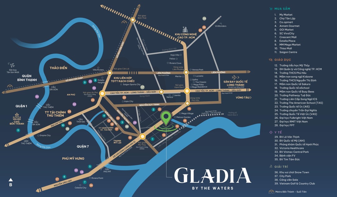 Gladia Heights nằm trong những khu vực đang phát triển nhanh nhất của Thành phố Hồ Chí Minh. Ở phía Bắc có Thảo Điền sang trọng, ở phía Đông có Trung tâm Tài chính Thủ Thiêm hiện đại, ở phía Nam có An Phú sầm uất và ở phía Tây có Phú Mỹ Hưng đẳng cấp.