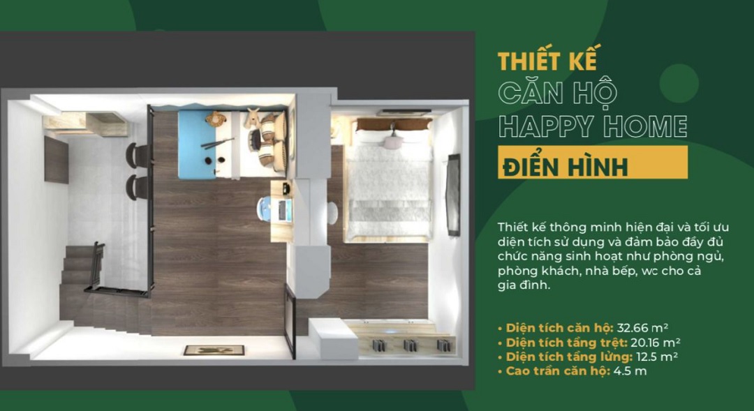 Dự án có diện tích tổng thể là 5,143 ha, bao gồm 16 block căn hộ có diện tích 32,7m2, 35m2 và 51,3m2. được thiết kế hợp lý và hiện đại