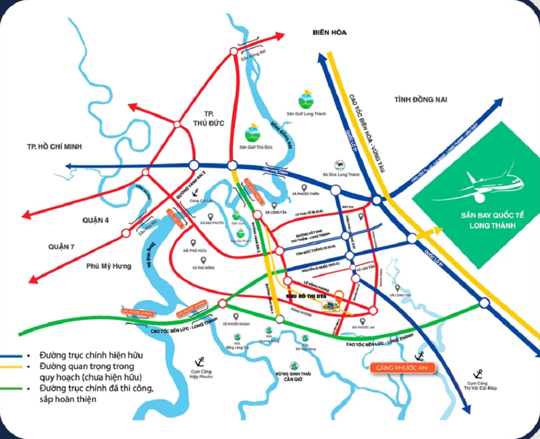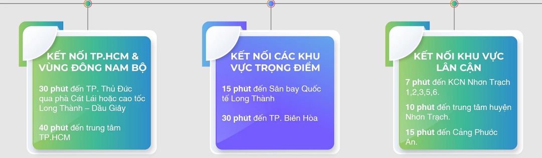 - 30 phút đến Thành phố Phía Đông thông qua Phà Cát Lái hoặc cao tốc Long Thành-Dầu Giây; 30 phút đến Sân bay Quốc tế Long Thành và Thành phố Biên Hoà;