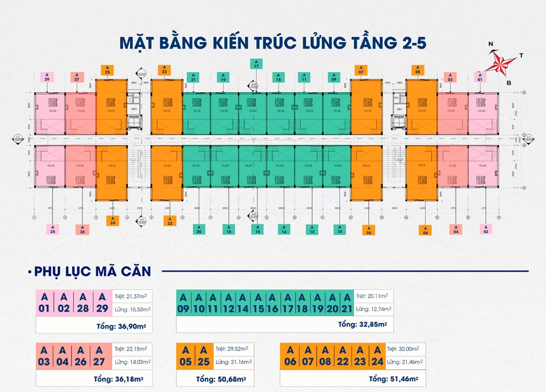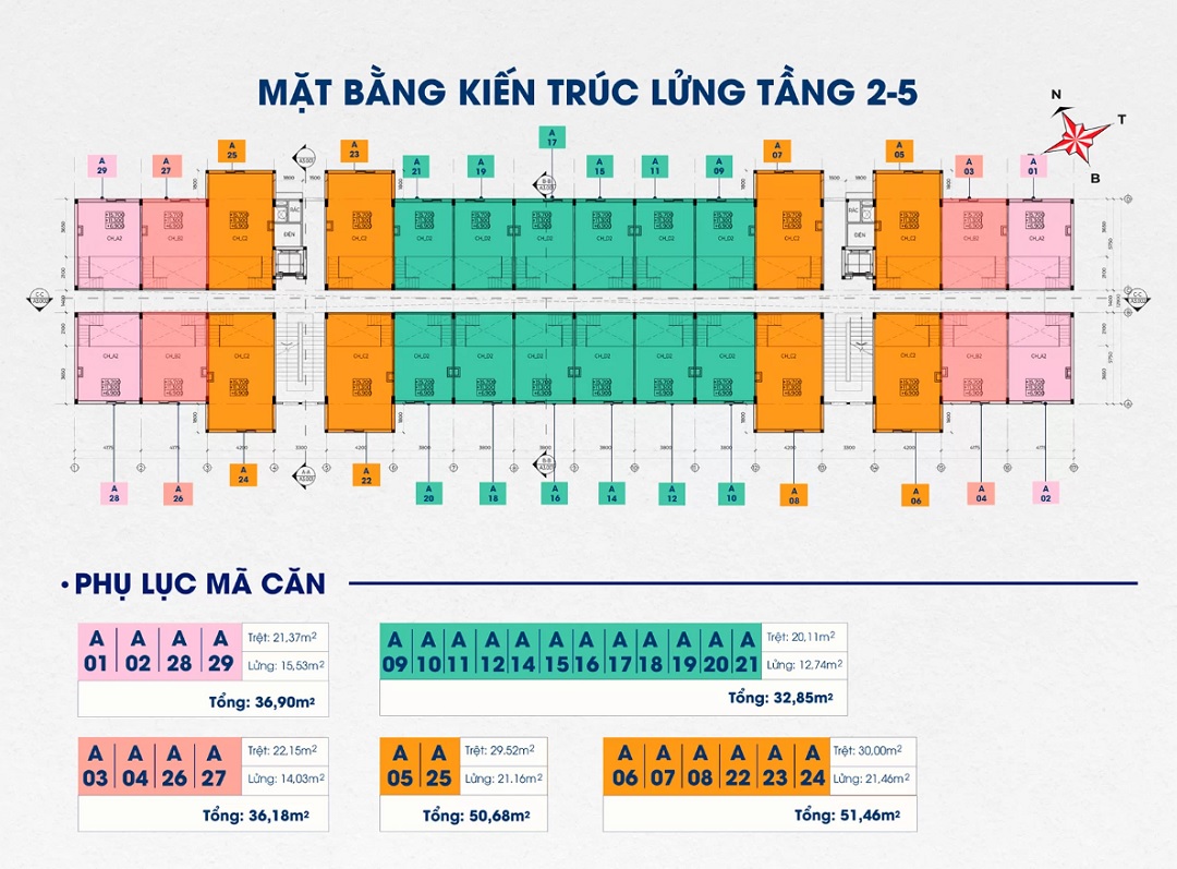 - Diện tích của căn hộ từ 32,7m2 đến 52,3m2.