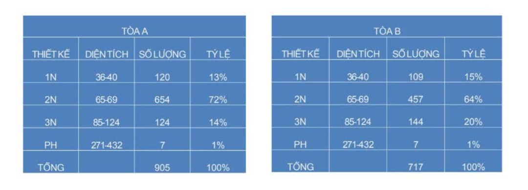- Số lượng sản phẩm: 1.622 căn (905 căn ở Tháp A và 717 căn ở Tháp B)