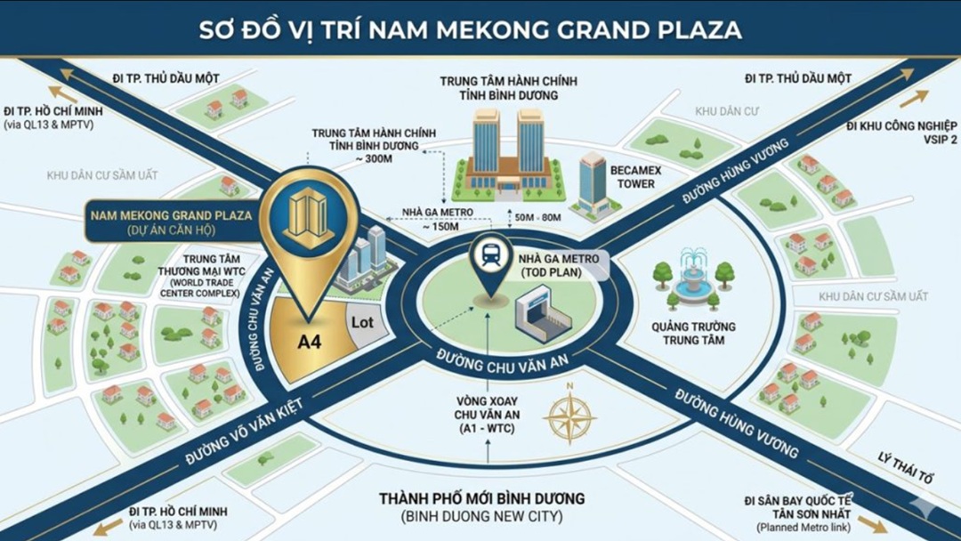Đặc biệt, vòng xoay A1 sẽ được phát triển thành một trung tâm thương mại, dịch vụ và giải trí lớn sẽ kết nối với tuyến metro sắp tới với TP. HCM. Cú hích quan trọng này đã làm tăng giá trị bất động sản của khu vực, biến Nam Mekong Grand Plaza Bình Dương thành lựa chọn tuyệt vời cho khách hàng thực tế và nhà đầu tư tìm kiếm các sản phẩm có tiềm năng tăng trưởng dài hạn và ổn định.