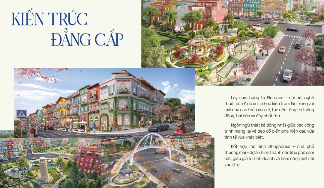 Thành phố Florence (Ý), nơi phát triển nghệ thuật Phục Hưng, là nguồn cảm hứng cho kiến trúc của Phú Gia Bảo Lộc. Các kiến trúc sư không chỉ sao chép mà còn khéo léo kết hợp vẻ đẹp cổ điển với những đường nét hiện đại. Dự án biến thành một khu phố châu Âu thu nhỏ đầy quyến rũ nhờ những dãy nhà với mái ngói đỏ, những ban công sắt nghệ thuật và những gam màu ấm áp tạo nên một tổng thể hài hòa, sống động và đầy lãng mạn.