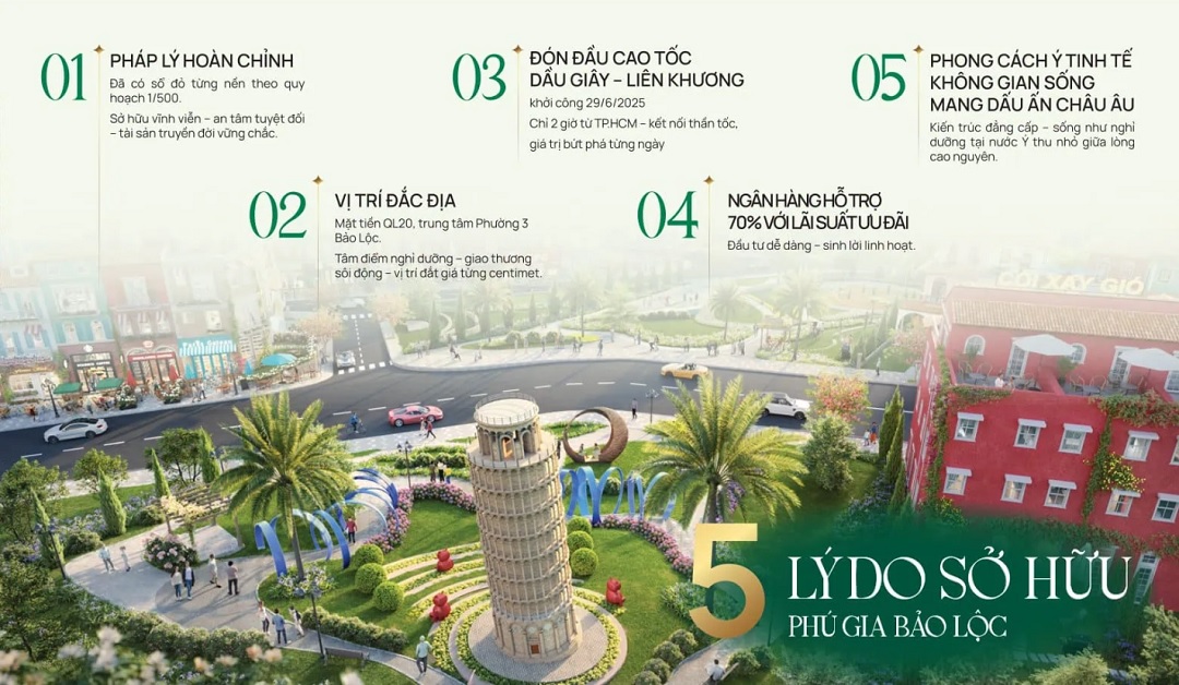 Phú Gia Bảo Lộc không chỉ là một dự án bất động sản mà còn là một kiệt tác kiến trúc mang đậm phong cách Ý tinh tế và lãng mạn. Nó hứa hẹn mang đến một không gian sống đẳng cấp, phồn vinh và phú quý cho những chủ nhân danh giá. Dự án, nằm ở vị trí tuyệt vời trong thành phố Bảo Lộc, tạo ra một biểu tượng sống mới, một “Tuscany thu nhỏ” giữa lòng cao nguyên. Đó là sự giao hòa hoàn hảo giữa tiện ích hiện đại và thiên nhiên trong lành. Nhờ vị trí chiến lược và cú hích hạ tầng, Bảo Lộc đang trở thành tâm điểm mới trong bức tranh phát triển sôi động của Tây nguyên. Phú Gia Bảo Lộc được coi là điểm sáng về cơ hội ở thời điểm này vì nó nằm gần trung tâm liên lạc của khu vực.