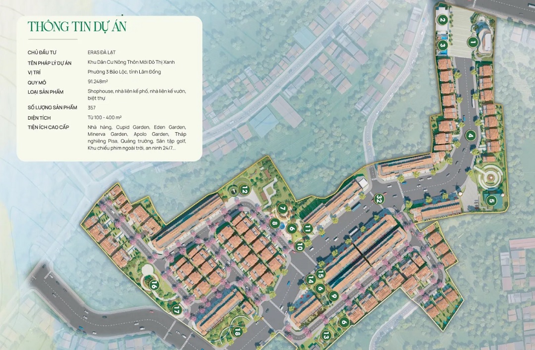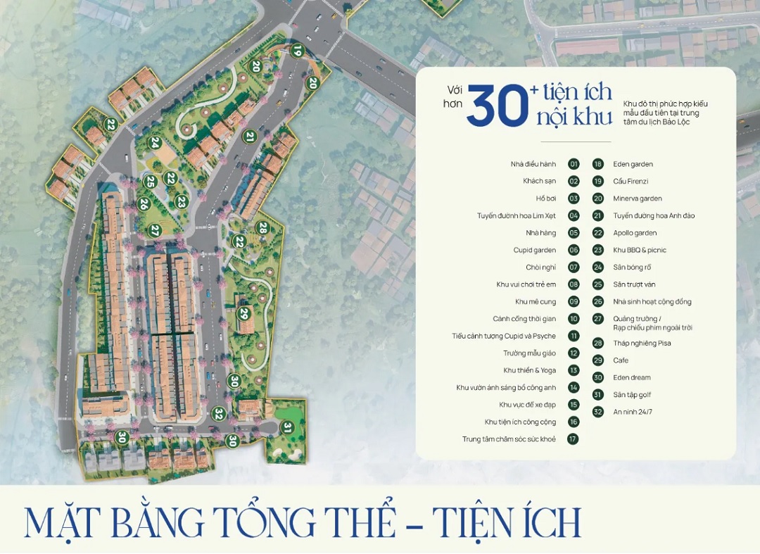Mục tiêu của chủ đầu tư là tạo ra hơn ba mươi tiện ích đẳng cấp lấy cảm hứng từ thần thoại La Mã cổ đại để cải thiện cuộc sống của cư dân Bảo Lộc. Điểm nhấn chính của dự án là bốn khu vườn được đặt tên theo ba vị thần La Mã: Cupid Garden, Minerva Garden, Apollo Garden và Eden Garden. Tất cả những khu vườn này được đặt xen kẽ và tạo ra không gian xanh mát và là những địa điểm “check-in” tuyệt vời cho khách du lịch khi đến thành phố Bảo Lộc.