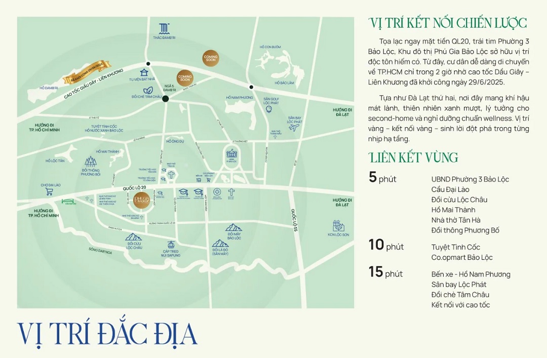 Ngay mặt tiền Quốc lộ 20, trung tâm của Phường 3, Bảo Lộc, Phú Gia Bảo Lộc nằm ở vị trí chiến lược. Đây là nơi “vàng” vì nó không chỉ mang lại không khí mát mẻ và trong lành đặc trưng của cao nguyên mà còn là nơi giao dịch sôi động. Gần nút giao chiến lược với cao tốc và Đường tỉnh 725, Phú Gia Bảo Lộc cung cấp liên kết nhanh chóng đến Thành phố Hồ Chí Minh, Đà Lạt, Nha Trang và các tỉnh Nam Trung Bộ. Đây không chỉ là một địa điểm dễ di chuyển mà còn là một “điểm rơi” tiềm năng cho những nhà đầu tư nhạy bén.