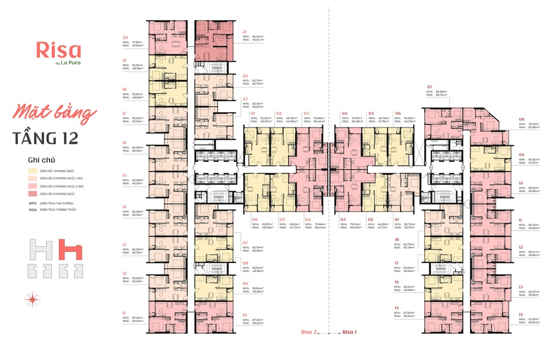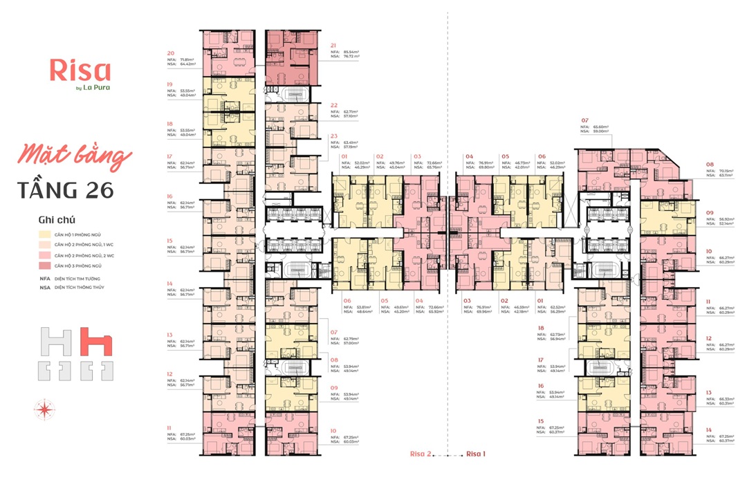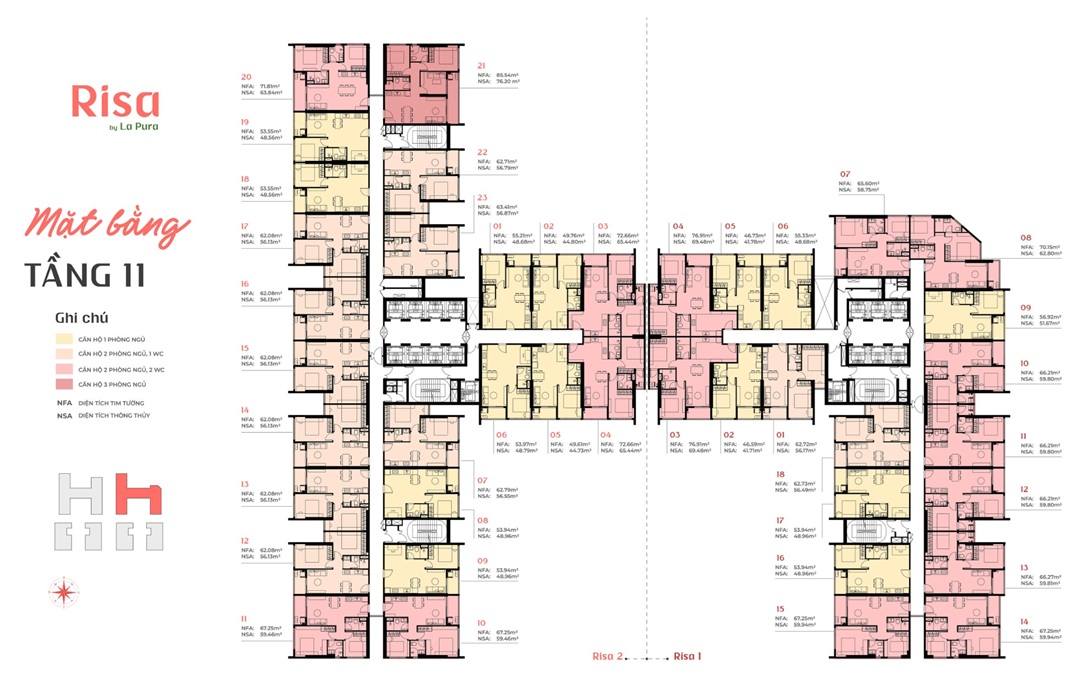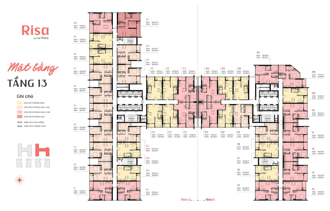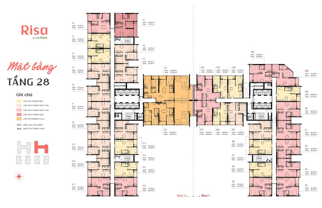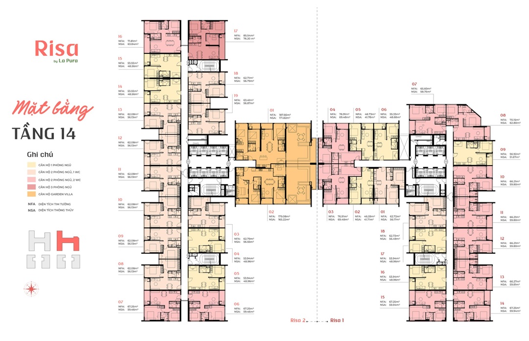 - Risa La Pura có quy hoạch bao gồm hai toà tháp căn hộ được bố trí như sau: