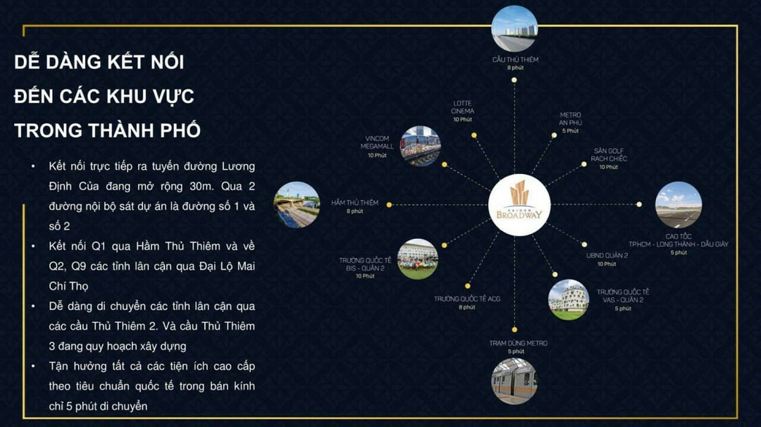 Có thể nói đây là một điểm cộng rất lớn cho giá trị gia tăng của căn hộ Sài Gòn Broadway quận 2 cũng như tính linh hoạt trong kết nối hạ tầng giao thông, giúp cho việc di chuyển giữa các khu vực, giữa các quận huyện trở nên dễ dàng hơn. .