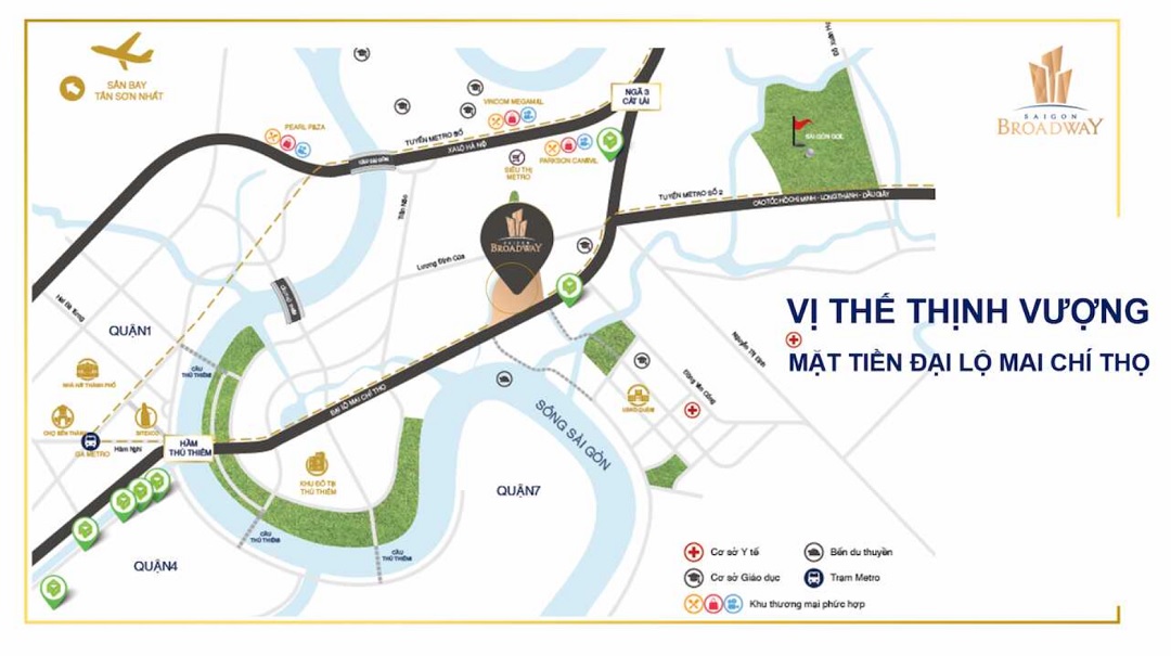 Tọa lạc ngay tại mặt tiền của đại lộ Mai Chí Thọ và gần trạm dừng Ga Bình Khánh của tuyến Metro số 2, dự án Sài Gòn Broadway mang lại tiềm năng sinh lời vượt trội cho các nhà đầu tư trong tương lai.