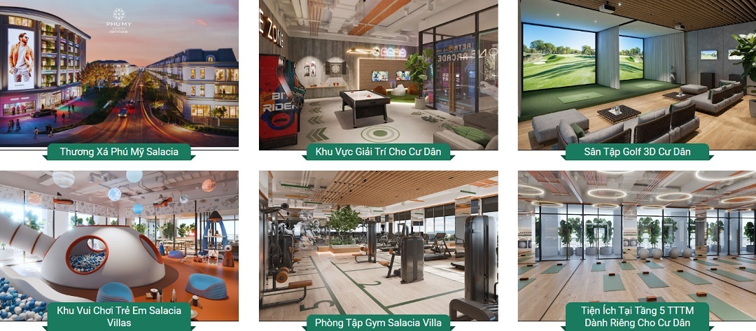 Khu Thương Xá Phú Mỹ Salacia Công viên nội khu, khu vực giải trí cho cư dân Công viên Cây Xanh, sân tập golf 3D dành cho cư dân Nhà Mẫu Liên Kế, khu vui chơi trẻ em tại Nhà Mẫu Biệt Thự Salacia Villas, Phòng Tập Gym Salacia Villas, Tiện ích tại tầng 5 TTTM dành riêng cho cư dân.