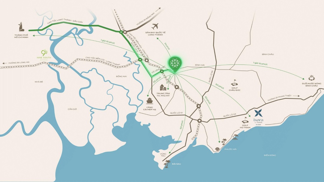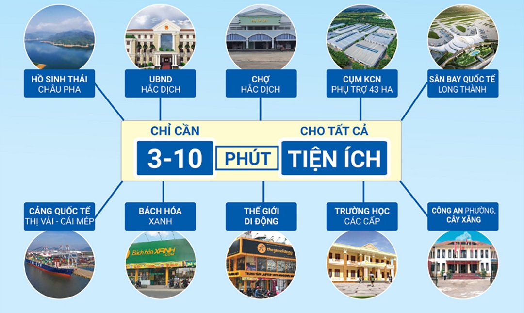 Đến điểm giao lên cao tốc TP. Hồ Chính Minh lúc 1h45 phút; Chợ Hắc Dịch lúc 1 phút; Bách Hóa Xanh lúc 3 phút; Bãi sau Vũng Tàu lúc 32 phút; Sân bay Long Thành lúc 33 phút; Vị trí đắt giá lúc 33 phút.