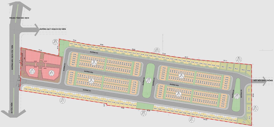 - Đất liền kề: 85 m2, 192 căn (5×17) Tổng diện tích xây dựng là 227 m2 với 4 tầng và 48 căn liền kề lớn. Diện tích đất là 110–112 m2. (5.5 x 20) DTXD: 272 – 298 m2 | 4 tầng .