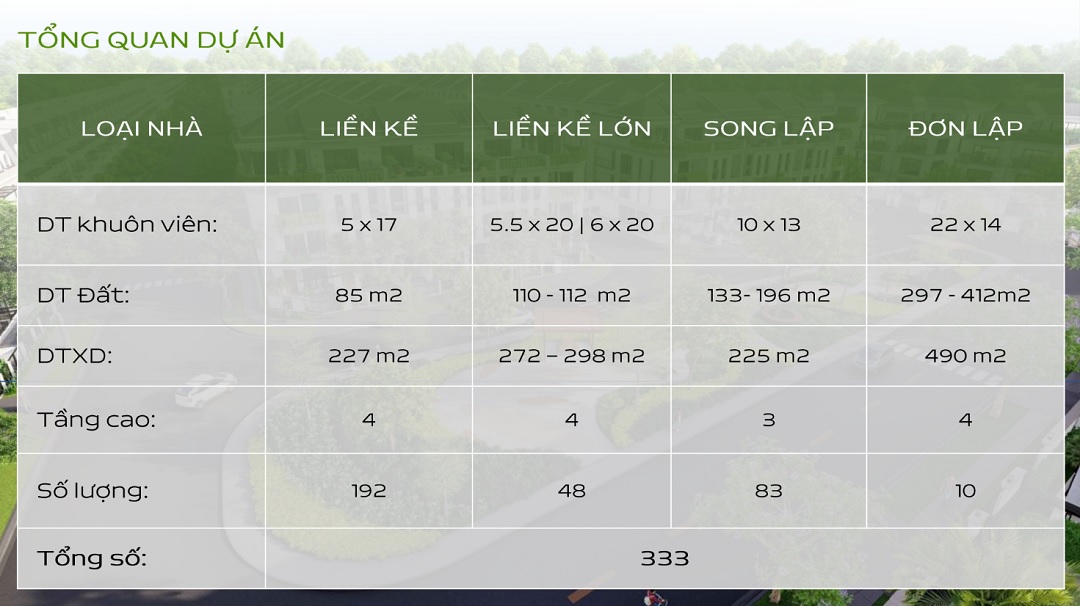- 83 căn song lập có diện tích từ 133 đến 196 mét vuông. (10×13) có diện tích 225 m2, có ba tầng và có 10 căn riêng biệt. Diện tích đất từ 297 đến 412 m2. (22 x 14) DTXD: 4 tầng, 490 m2.