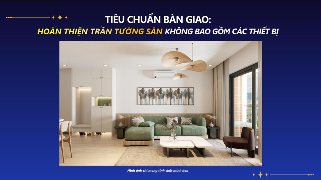 - Tiêu chuẩn bàn giao bao gồm sàn, trần, tường và thiết bị nội thất.