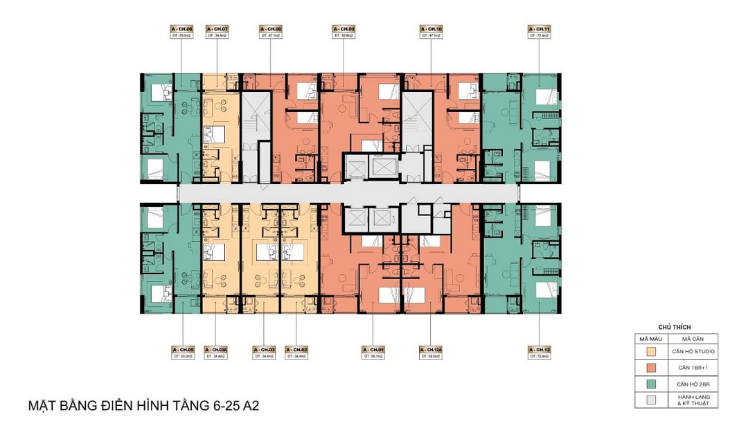- Căn hộ có 1 ngủ và tổng cộng 46.9-59.6 mét vuông : Đáp ứng nhu cầu của các nhà đầu tư hoặc gia đình nhỏ.