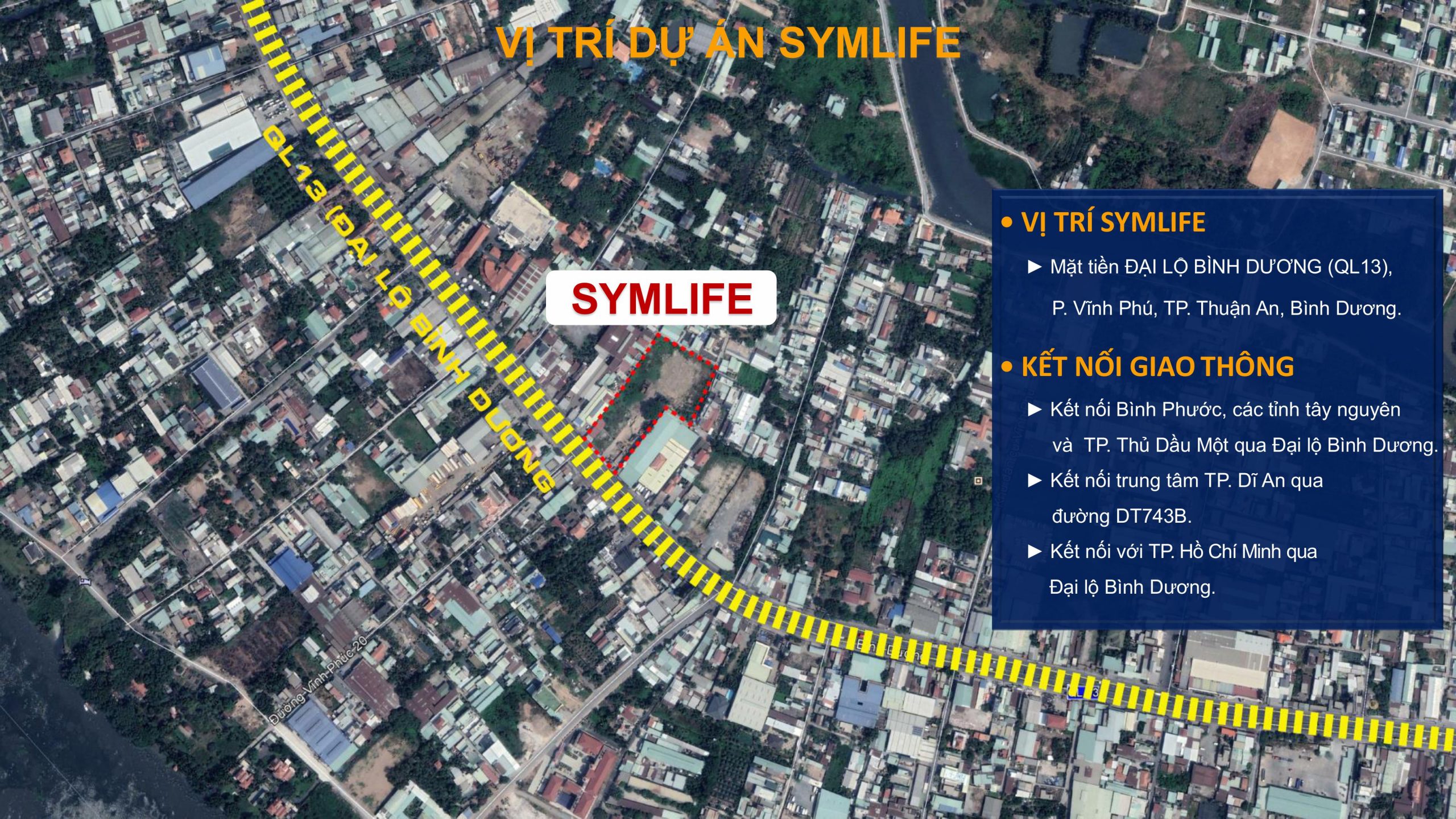 Dự án căn hộ Symlife nằm ở giữa Thành phố Thuận An, Bình Dương. Căn hộ Symlife cung cấp các phương tiện giao thông thuận tiện để tiếp cận trung tâm thành phố Hồ Chí Minh. Căn cư Symlife nằm trên trục đường huyết mạch kết nối các tỉnh đông Nam Bộ với nhau.