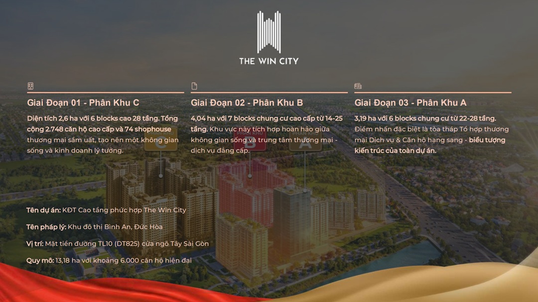 Dự án The Win City là sản phẩm tiếp theo của Thắng Lợi Group ra mắt thị trường bất động sản trong Quý 3/2022 tại huyện Đức Hòa, tỉnh Long An, nối tiếp thành công của các dự án The Diamond City và The Sol City. Với hệ thống quản lý – vận hành ứng dụng công nghệ thông minh và dịch vụ đạt chuẩn 5 sao quốc tế, The Win City Thắng Lợi là nơi hội tụ trọn vẹn của những chuẩn mực giá trị sống hàng đầu. Khu căn hộ này được phát triển trên quy mô ấn tượng, bao gồm 18 block cao từ 24 đến 33 tầng, dự kiến cung ứng ra thị trường số lượng lên đến 10.000 sản phẩm đa dạng từ căn hộ, shophouse, nhà phố đến biệt thự.