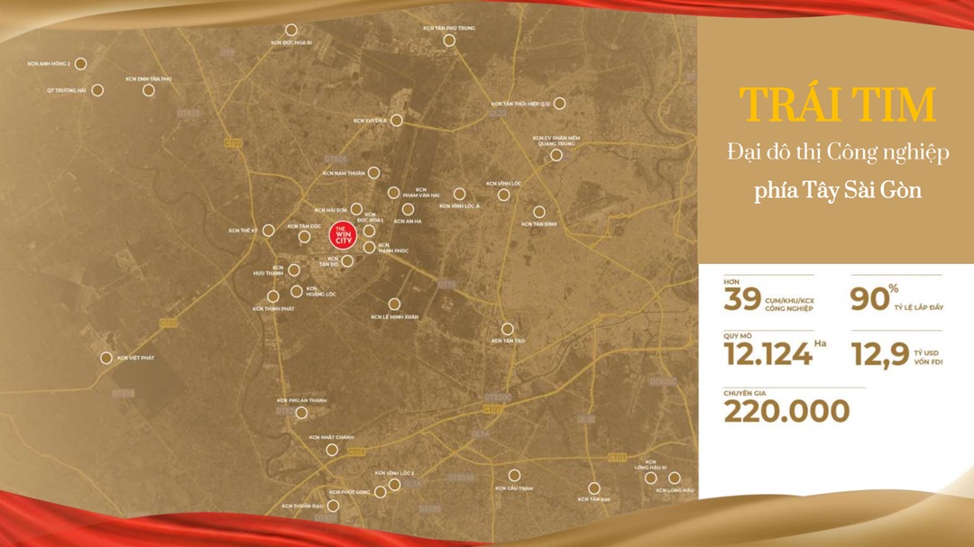 Từ dự án The Win City, việc di chuyển đến trung tâm TP. HCM chỉ mất khoảng 35 phút. Đây là một trong những dự án bất động sản hiếm hoi sở hữu vị trí vàng của vùng kinh tế phía Tây Bắc Sài Gòn, tâm điểm kết nối TP.HCM – Long An – Tây Ninh, đồng thời hưởng lợi trực tiếp từ quy hoạch thành lập các thành phố mới Củ Chi và Đức Hòa trong tương lai gần.