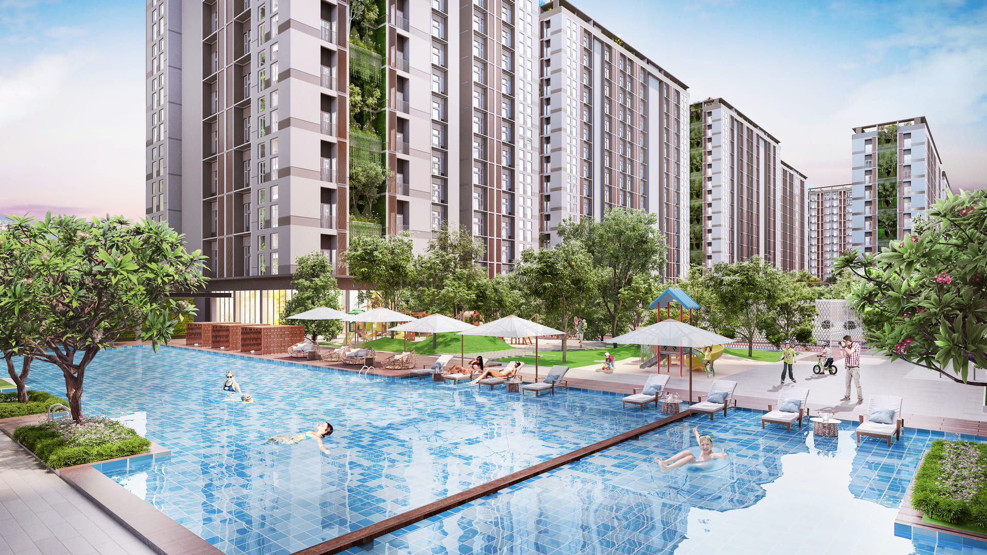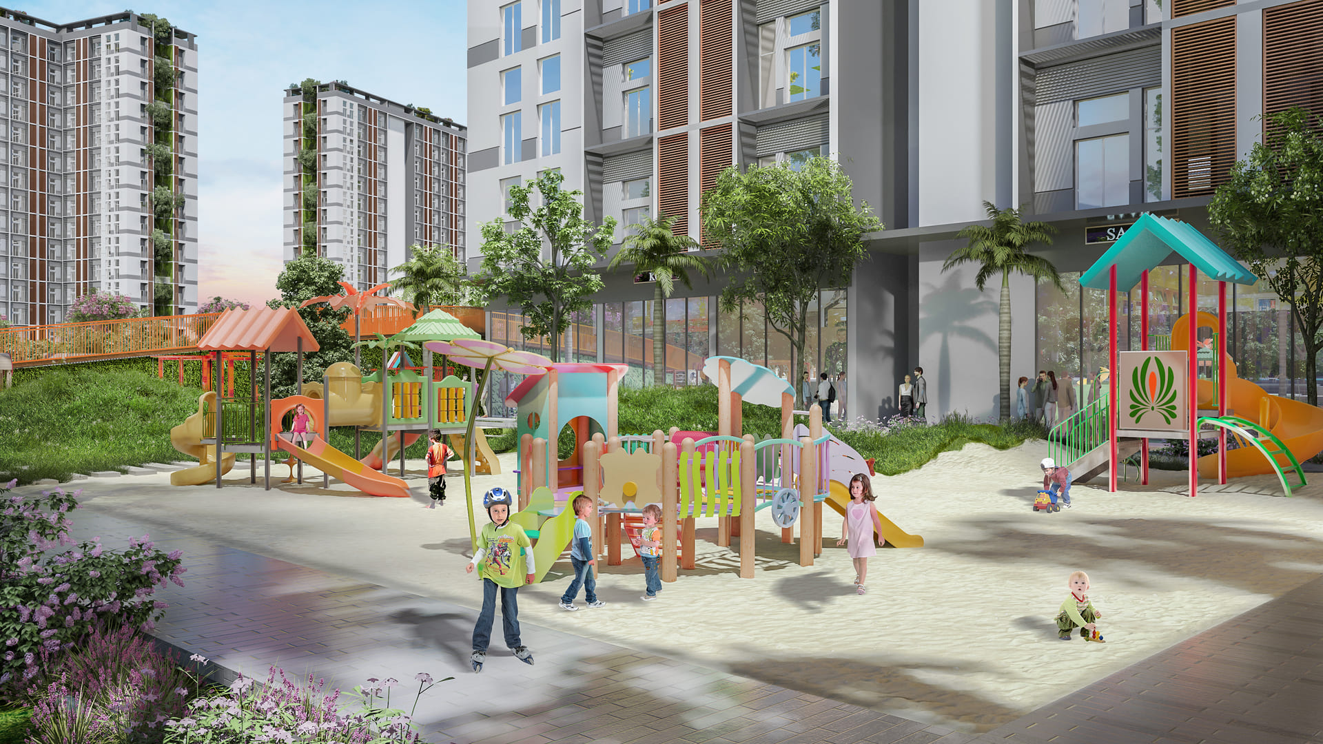 - Giải trí & Thể thao: Khu thể dục thể thao trong nhà và ngoài trời, khu vui chơi dành riêng cho trẻ em.